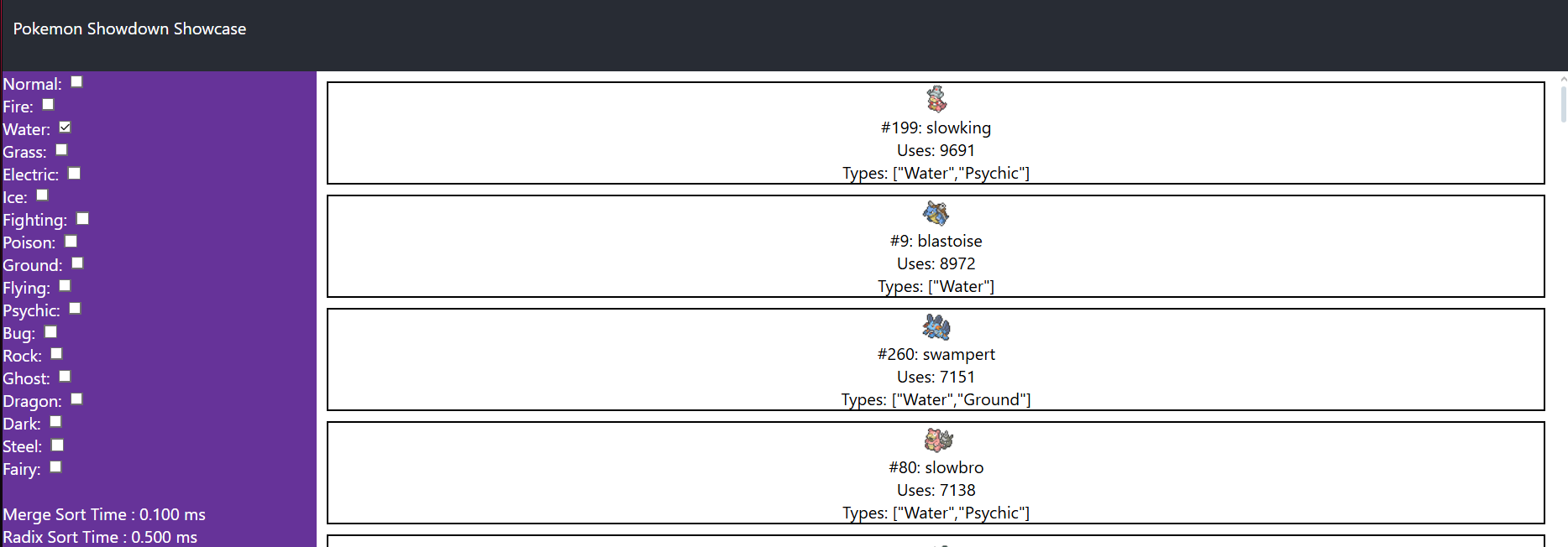 This was the second website that I ever worked on and it was a group project with Case Zumbrum and Louis Li. The goal of the site was to create a place for people interested in playing competitive Pokemon on Pokemon Showdown to see what the most popular pokemon by types are based off of the past 20,000 matches played on the site which we access through Pokemon Showdown's API. If you want to take a look then you can by clicking the link above.