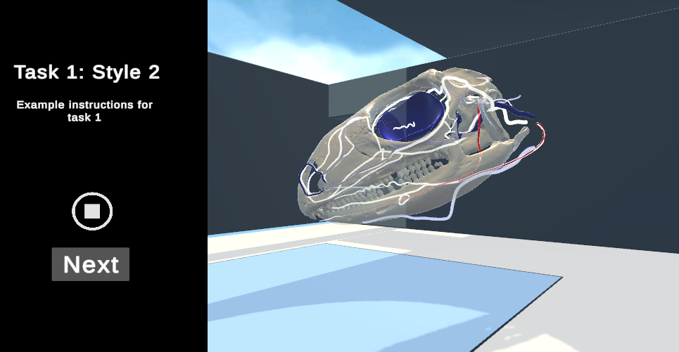 The above image, however, comes from the desktop view with a DVR render of an Iguana skull where the participant would be able to interact with the scene by clicking and dragging or using the mouse wheel to scroll in and out. This render would likely be used in a Shape Description task where the user would be given a specific bone and asked to match it to a curve or shape that best matches it.